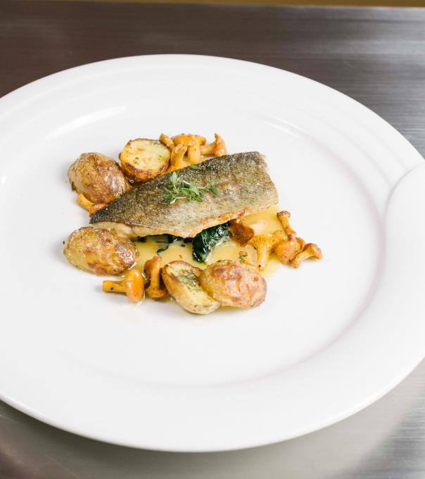Forellenfilet mit Pfifferlingen und Rosmarinkartoffeln.