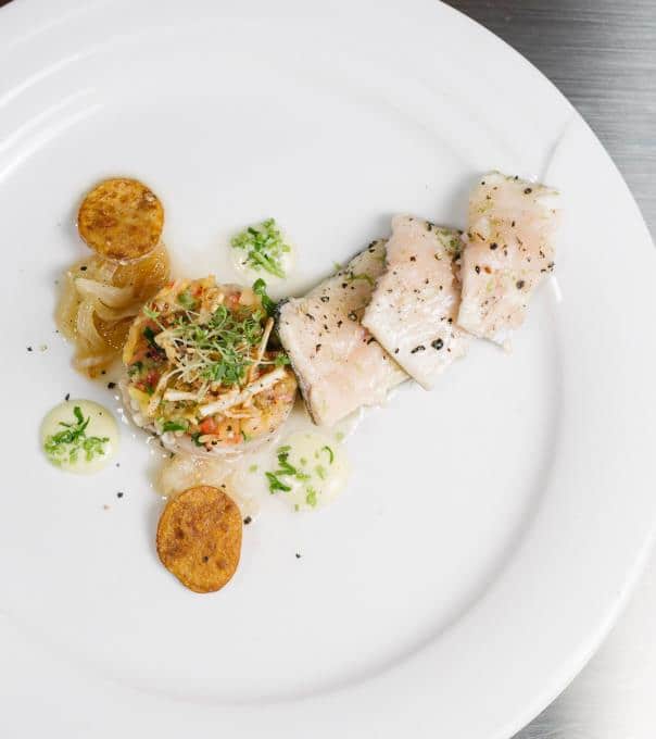 Manuels zweierlei von der Forelle mit Salsa und Kartoffelchips.