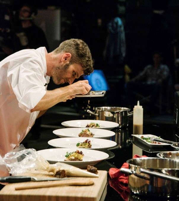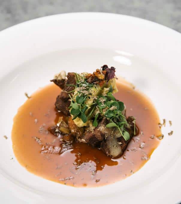 Er serviert der Jury geschmorte Kalbsbäckchen an Jus mit Polenta und frisch gehobeltem Trüffel.