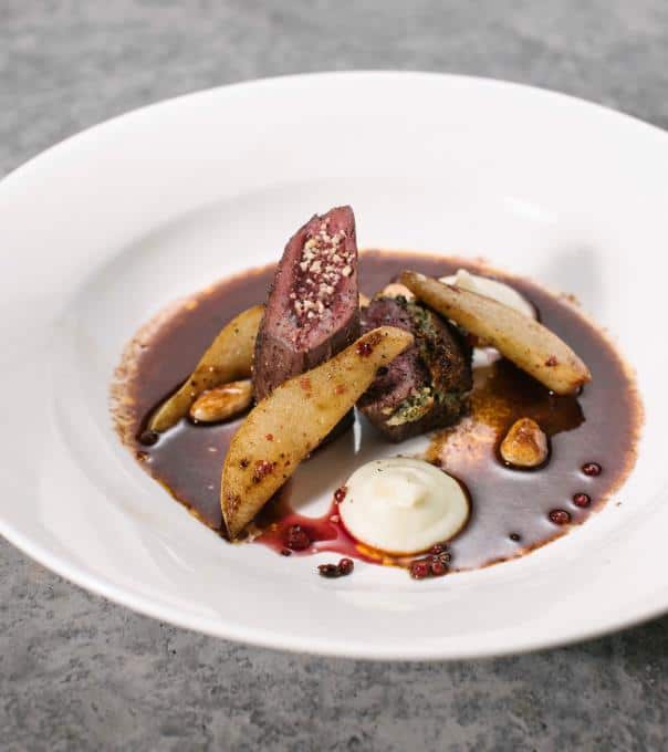 Karens Hauptgang: zweierlei vom Rehrücken mit Kürbiskernkruste, Blumenkohl-Meerrettich-