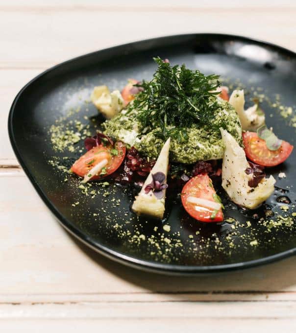 "Joghurtmousse vom grünen Tee mit Artischocken und Tomaten-Fenchel-Salsa" ist die Signature-Vorspeise mit der Manuel den ersten Pluspunkt verbuchen möchten.