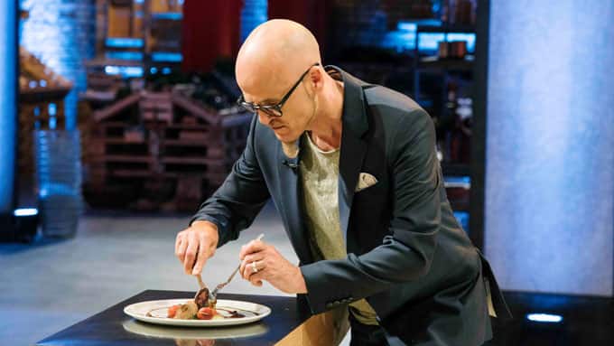 ... darf er aussuchen, mit welchen Aromaten die Kandidaten im Pressure Test kochen müssen. Grundlage ist ein Schwäbisch-Hällisches Landschwein. Zur Auswahl dazu stehen: Ouzo, Orangensaft oder Kaffee. Michael entscheidet sich für Kaffee.