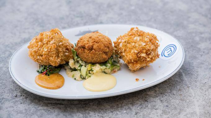 Team rot ist zwar in der Unterzahl, ist aber bereits beim Anrichten des "Dreierlei Bitterballen mit Dips und Stamppot".