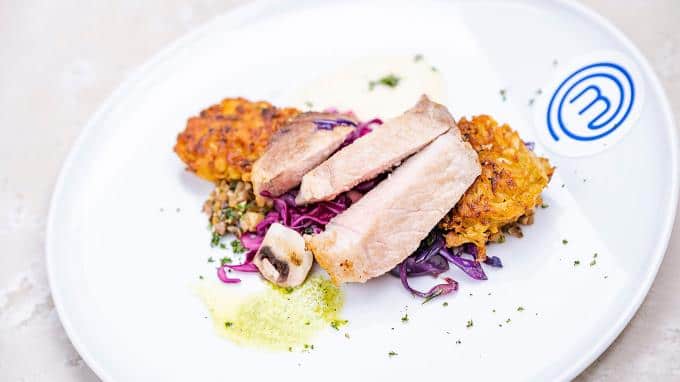 Team blau versucht die Gourmets mit Ibérico-Karree auf Rösti mit Rotkohl und Beurre blanc zu überzeugen.