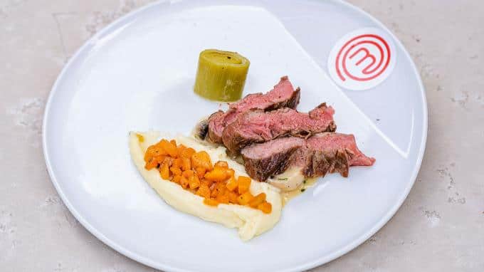 Team rot präsentiert den Gästen: Flank Steak mit Kartoffelpüree und Pilzrahmsauce.