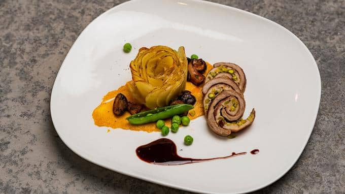 Fabian hat die Jury und Gastjuror Alexander Kumptner mit seiner Kalbsroulade an Kartoffelgratin und Kartoffelpüree am meisten überzeugt.