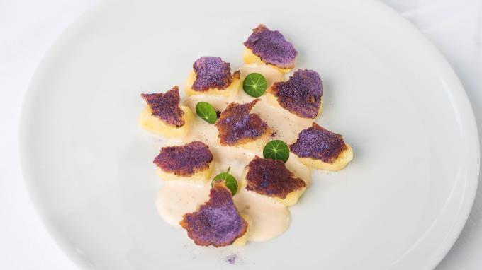 Kartoffel-Gnocchi, Schaum von der Kartoffel und Räucherfisch. Garniert mit Tiroler Speck und dem Staub von violetter Kartoffel.